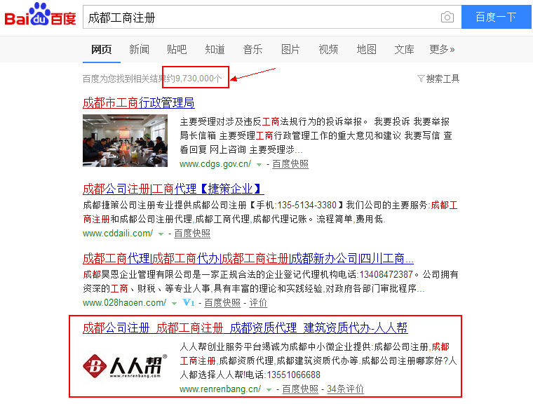 上图可以看出“成都工商注册”的相关结果是973万,说明在搜索引擎所抓取的全球所有站点网页里面,有973万的网页集合存在着“成都工商注册”这个词的出现,而“成都商标注册”出现的结果211万。通过这组数据可以看出“成都工商注册”明显要比"成都商标注册"优化难度要大,因为一个词是从973万的文档集合里面去把排名优化到100名以内,而另外一个词只需要211万。